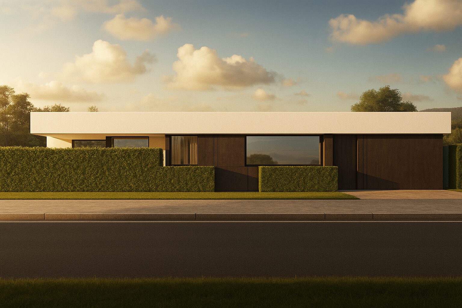 Straßenseitig wirkt das Haus zurückhaltend – gartenseitig hingegen großzügig und offen, mit weiten Blickachsen und fließenden Übergängen zwischen Innen und Außen.