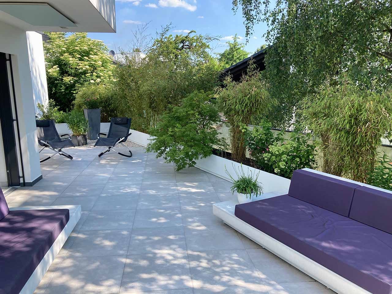 Im gesamten Haus wurde derselbe Bodenbelag verlegt – großformatige 80 × 80 cm Feinsteinzeugfliesen in einem hellen, weiß-beigen Beton-Travertin-Look. Die Terrassen greifen dieses Material mit 60 × 60cm Außenfliesen auf, wodurch ein fließender Übergang zwischen Innen und Außen entsteht.