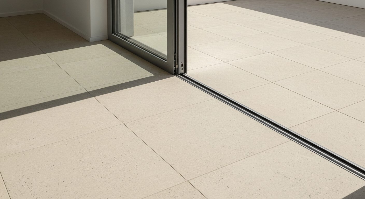 Im gesamten Haus wurde derselbe Bodenbelag verlegt – großformatige 80 × 80 cm Feinsteinzeugfliesen in einem hellen, weiß-beigen Beton-Travertin-Look. Die Terrassen greifen dieses Material mit 60 × 60cm Außenfliesen auf, wodurch ein fließender Übergang zwischen Innen und Außen entsteht.