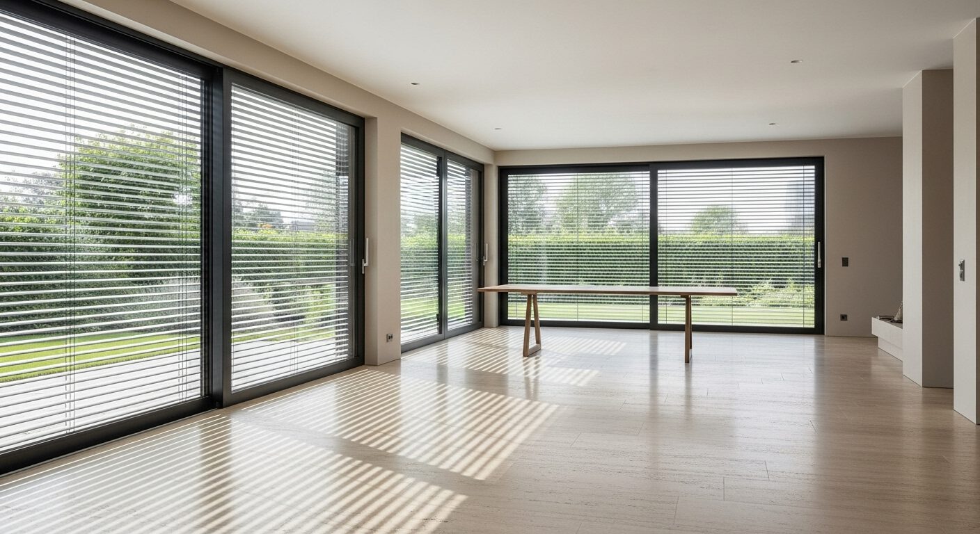 Großzügige Fensterflächen und zahlreiche Schiebetüren lassen Tageslicht tief in die Räume fluten. Wo es möglich und sinnvoll war, wurden bodentiefe Elemente eingesetzt. Außen sorgen Raffstores mit Z-Lammellen für präzise Lichtsteuerung und sommerlichen Wärmeschutz.