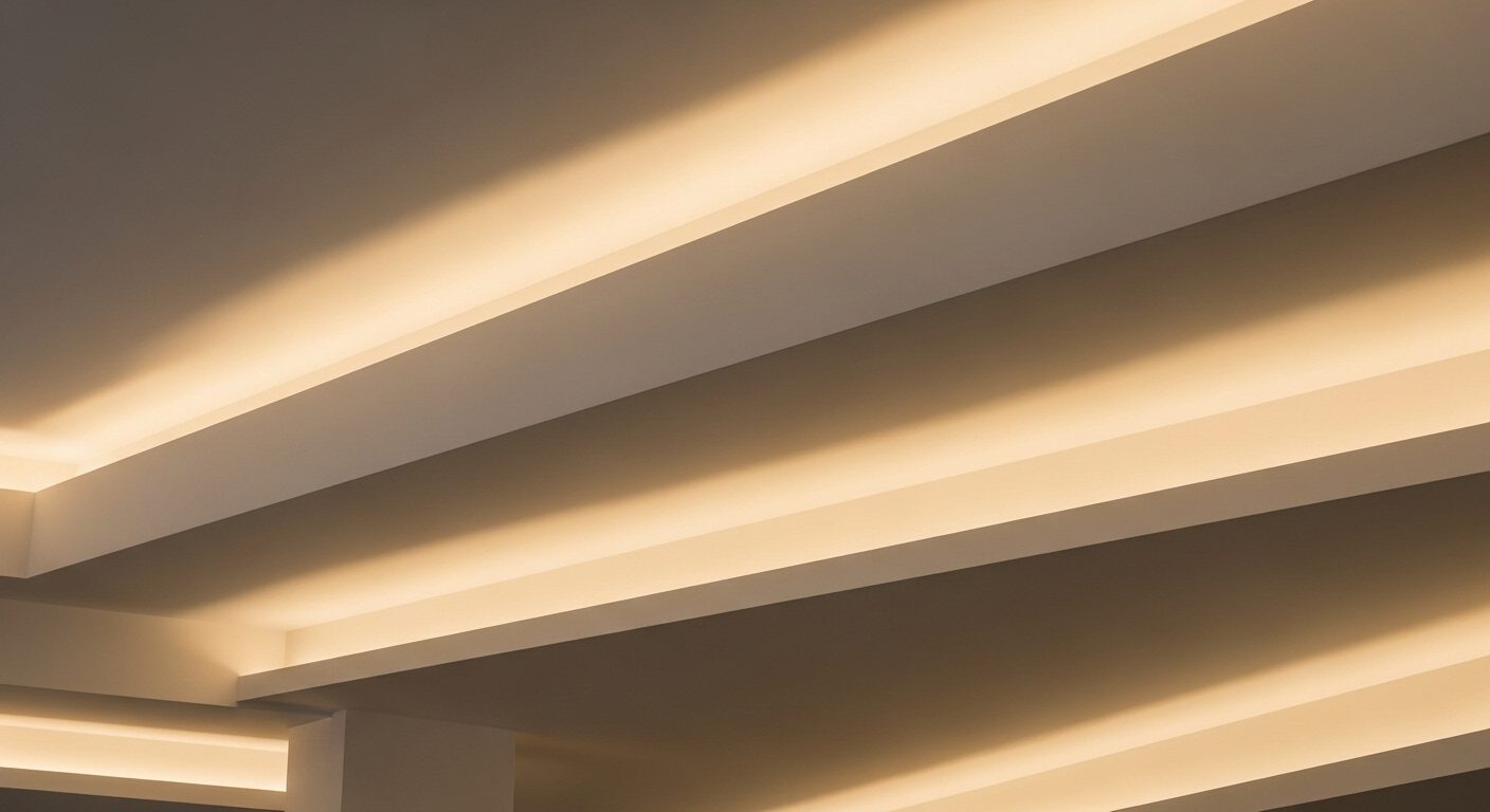 Abgehängte Decken mit integrierten LED-Lichtleisten strukturieren die Räume subtil. Indirekte Beleuchtung in Lichtvouten und präzise platzierte Einbauleuchten schaffen Atmosphäre ohne sichtbare Lichtquellen.