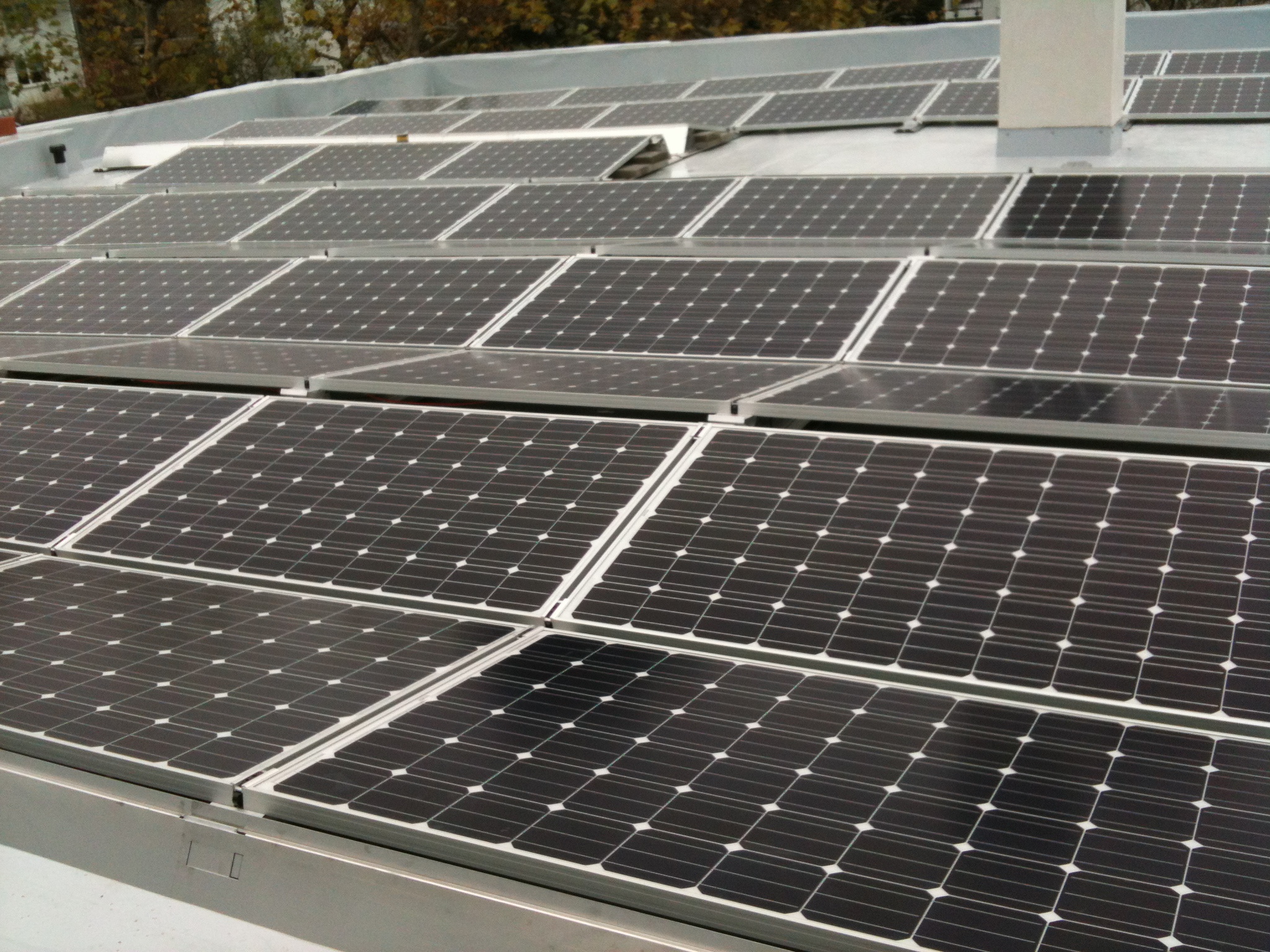 Eine 21 kWp Photovoltaikanlage bedeckt fast das vollständige Flachdach – durch die umlaufende Attika von außen nicht sichtbar.